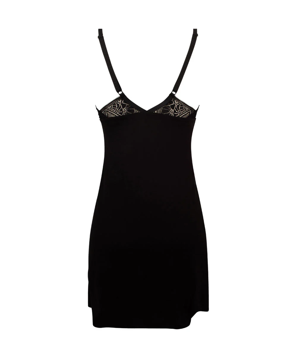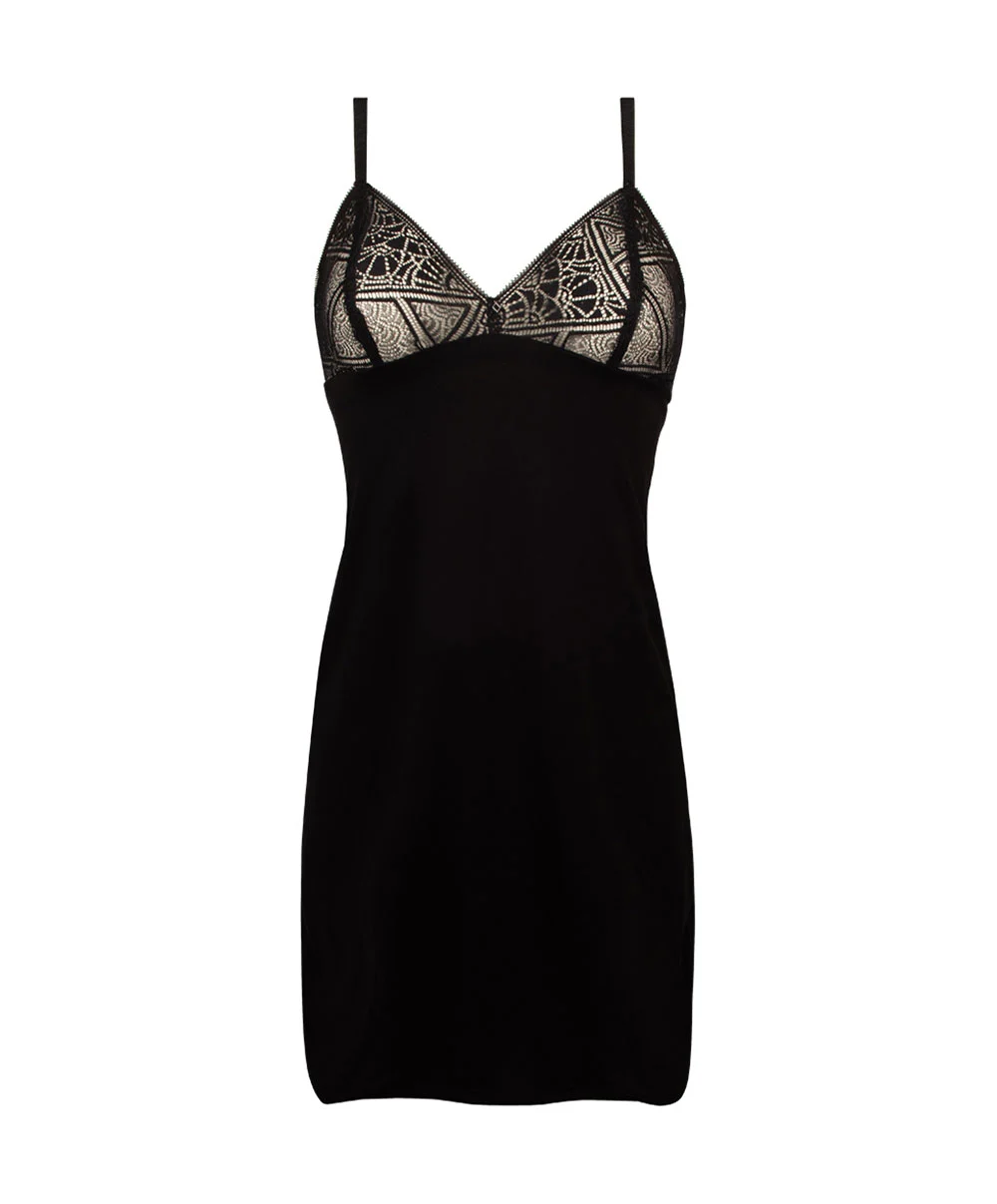 -Cette nuisette offre une coupe mi-longue (au dessous du genou), des bretelles plutôt larges réglables, un décolleté en V plongeant très séducteur et des empiècements de dentelle graphique ajourés à la transparence séductrice qui révèle subtilement le grain de votre peau, au niveau de la brassière et du dos.