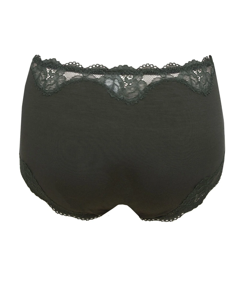 -Le tour de cuisses et la taille de ce shorty sont délicatement ornés d’une magnifique dentelle florale ton-sur-ton pour jouer le total look kaki et vous conférer une sophistication particulière.