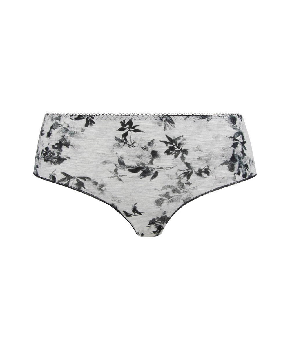 -Sous-vêtement confectionné en maille coton micromodal grise chinée tonique pour un bien-être et un fitting incomparables, présentant des végétaux imprimés à l’encre de Chine, et se mariant à merveille avec des détails et des inserts en dentelle Leavers noire pour un contraste efficace.