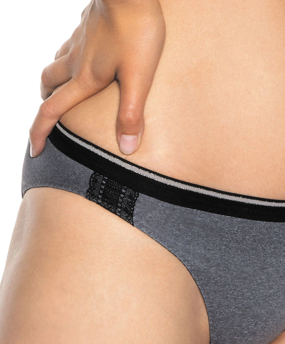 -Ce dessous chic et sport possède en finitions deux laizes verticales de dentelle noire sur les côtés pour une touche de féminité ainsi qu’une bande stretchy rayée noire et argentée en guise de ceinture pour un fitting parfait qui renforce le design sportif de cette création Antigel.