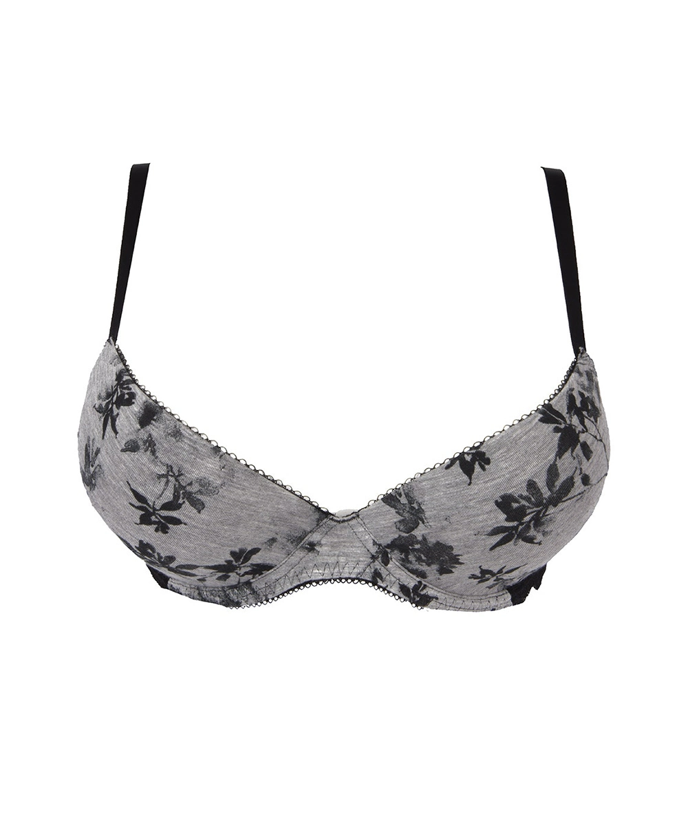 -Sous-vêtement confectionné en maille coton micromodal grise chinée tonique pour un bien-être et un fitting incomparables, présentant des végétaux imprimés à l’encre de Chine, et se mariant à merveille avec des détails et des inserts en dentelle Leavers noire pour un contraste efficace.