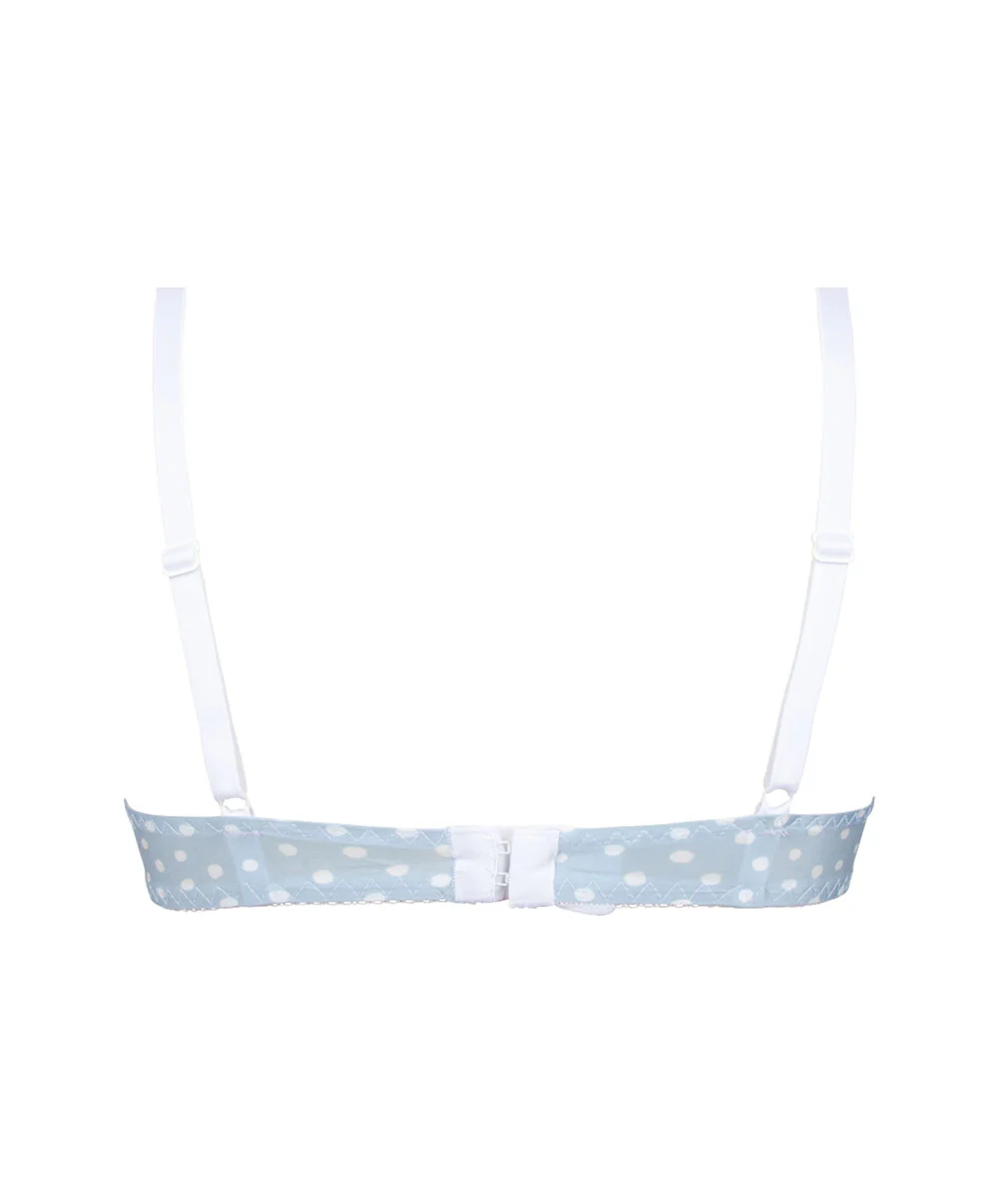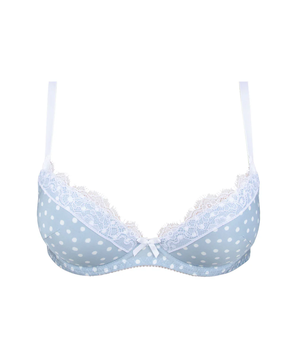 -Soutien-gorge moulé décolleté plongeant au motif très élégant à pois blancs sur un fond bleu ciel pastel plein de douceur et d’élégance pour une silhouette à la fois vintage, chic et glamour façon pin-up… Séduction garantie !