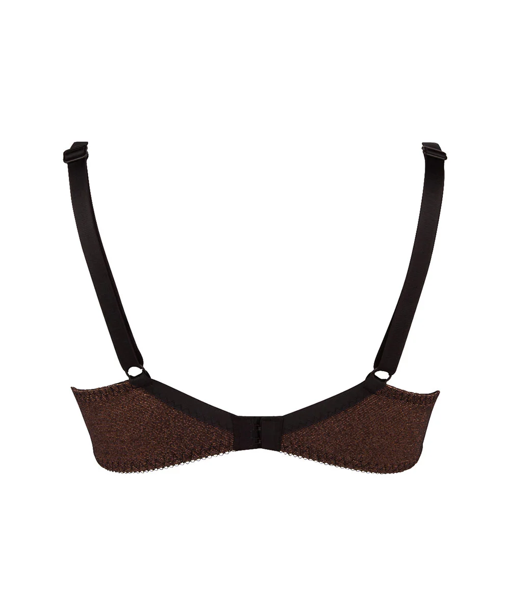 -Ce soutien-gorge emboitant propose des bonnets plutôt enveloppants en trois parties en maille microfibre douce et opaque à paillettes cuivrées. Il offre un joli décolleté pigeonnant tout en vous assurant un soutien infaillible dans un écrin à glitter étincelant.