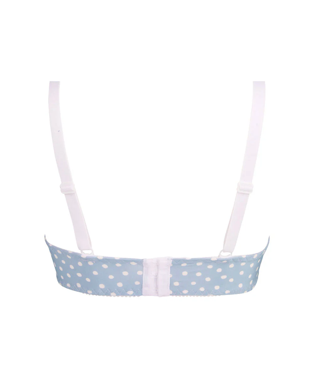 -Soutien-gorge grande taille sans baleines décolleté plongeant au motif très élégant à pois blancs sur un fond bleu ciel pastel plein de douceur et d’élégance pour une silhouette à la fois vintage, chic et glamour façon pin-up… Séduction garantie !