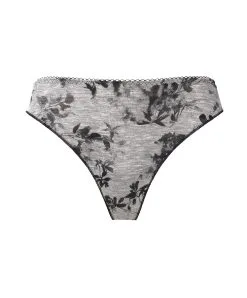 -Sous-vêtement confectionné en maille coton micromodal grise chinée tonique pour un bien-être et un fitting incomparables, présentant des végétaux imprimés à l’encre de Chine, et se mariant à merveille avec des détails et des inserts en dentelle Leavers noire pour un contraste efficace.