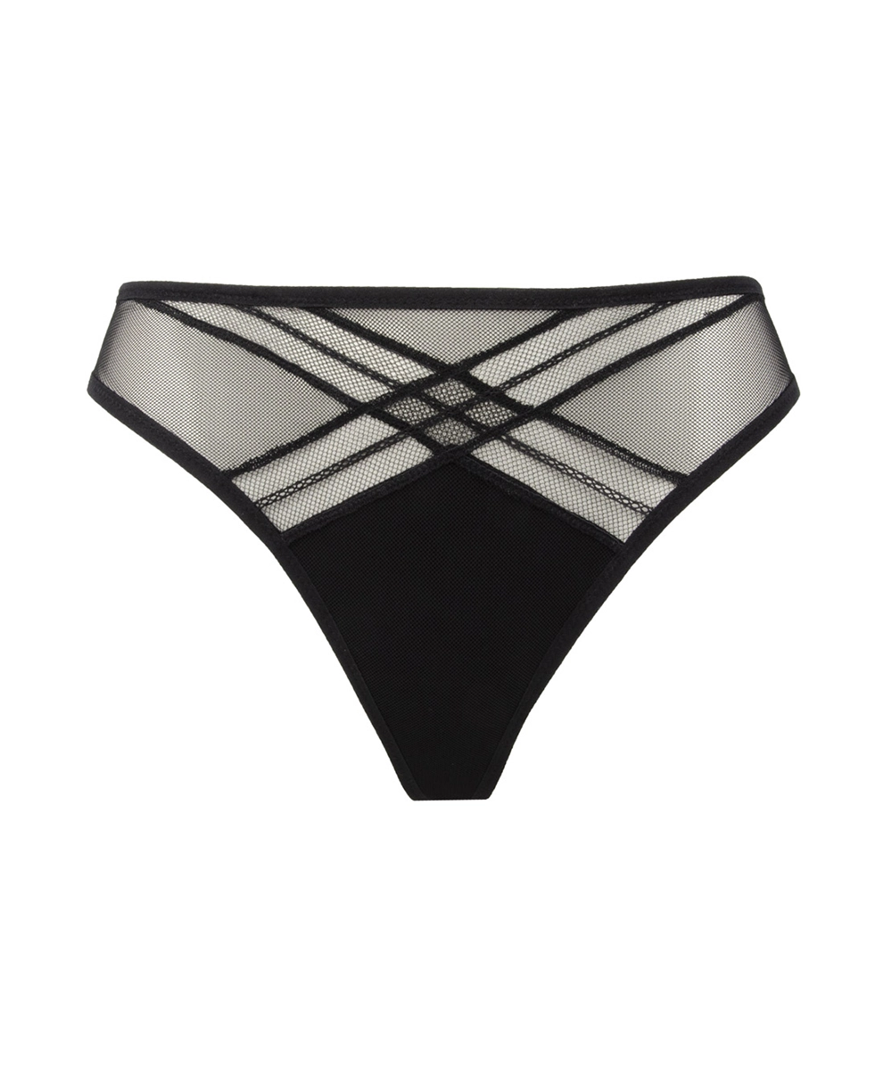 -En finitions, vous retrouverez de superbes bandes graphiques ajourées se croisant sur une résille glamour ainsi que des bords stretch satinés en guise contour qui rappellent avec malice le bondage.