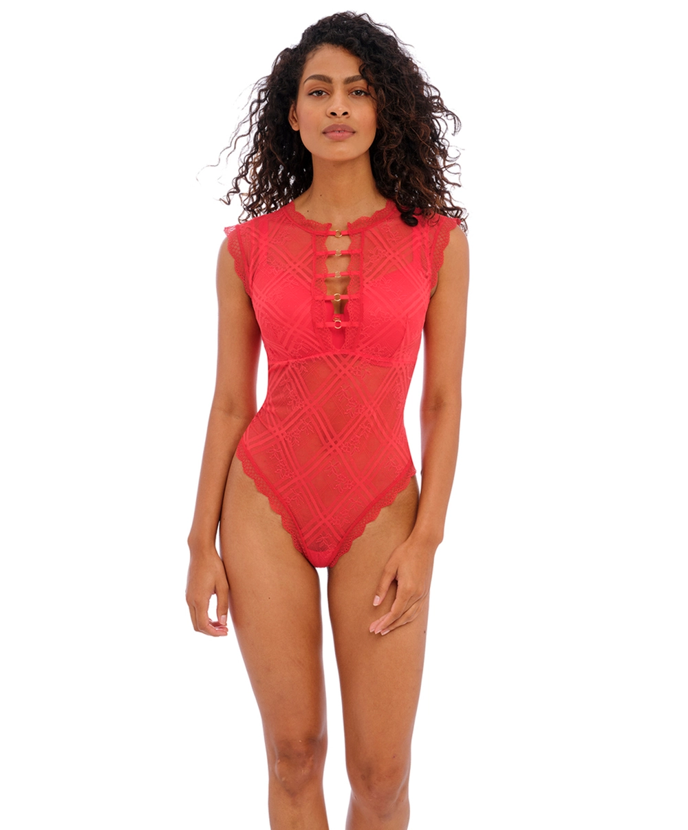 Body sexy en dentelle collection permanente de dessous sexy Freya Fatale de la maison Freya lingerie, coloris rouge chili.