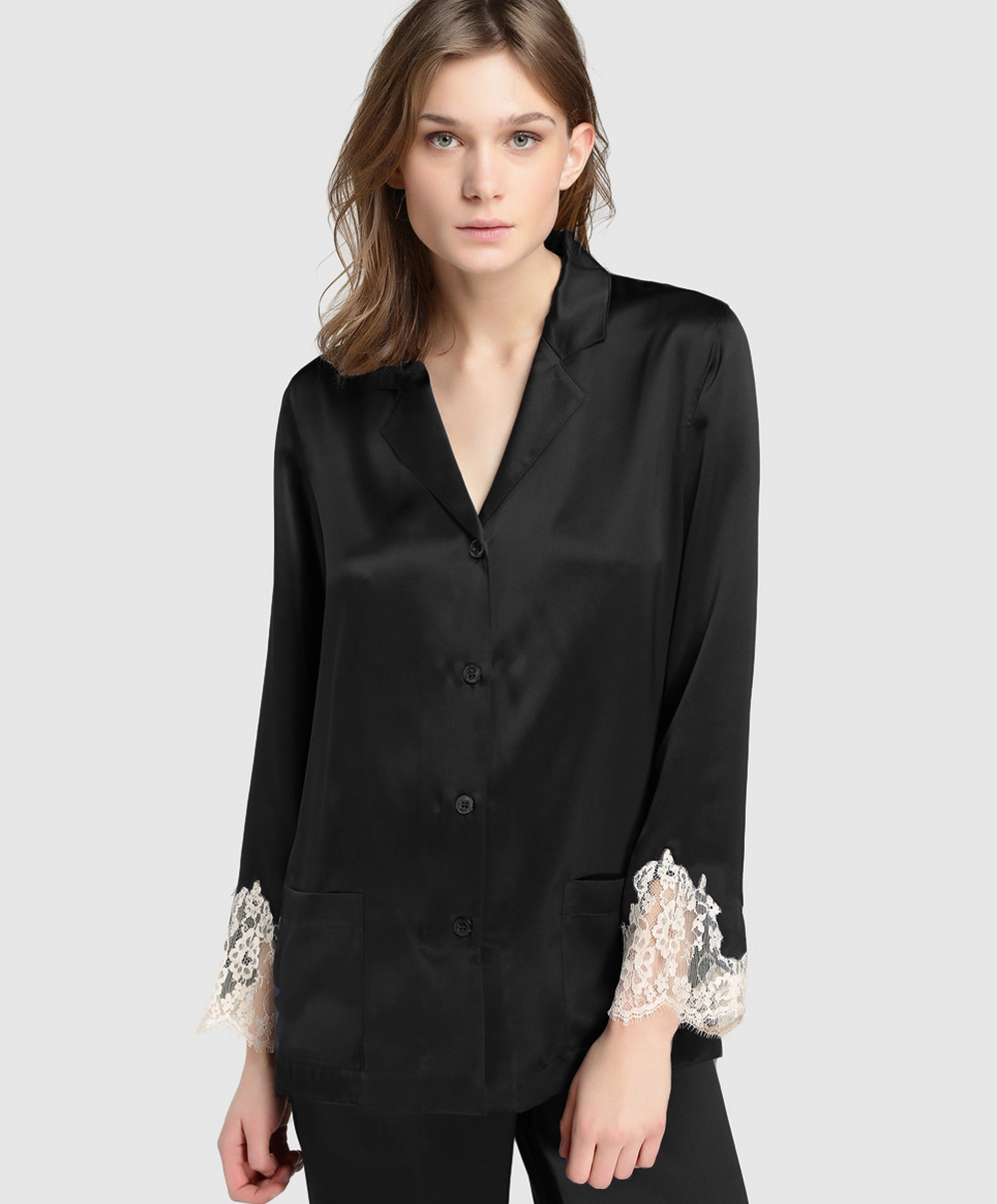 Chemisier en soie haut de pyjama Lise Charmel collection Splendeur Soie. Cette superbe chemise en soie a été confectionné dans une matière de légende pour une douceur et un confort incomparables. Elle présente aux manches un superbe empiècement de dentelle de Calais florale qui ajoute encore à la richesse visuelle de ce vêtement en soie. Ce superbe article de lingerie de soie offre également une boutonnière nacrée et un col à revers très élégant rappelant un peu l’encolure d’un smoking ou d’une veste de tailleur. Ce chemisier se portera idéalement en ensemble avec le pantalon en soie de la même collection pour une allure très haute couture.