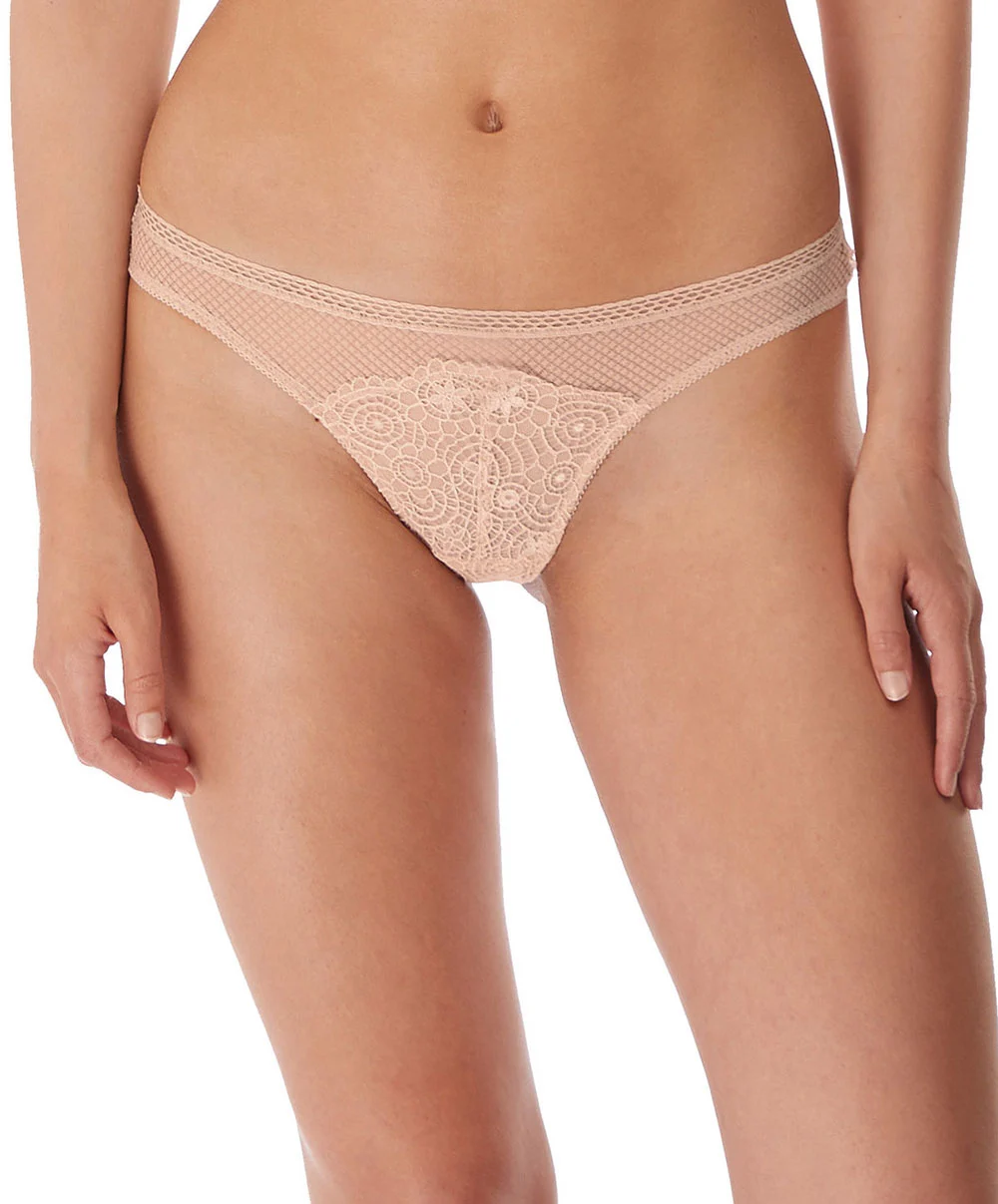 Culotte brésilienne collection Expression de chez Freya lingerie. Ce slip brésilien Freya à la fois glamour et confortable met en valeur une maille à motifs géométriques ainsi qu’une dentelle crochet, toutes deux ajourées pour une séduction à son apogée. Les finitions de ce slip femme comprennent une taille élastique soulignée de picots au design très contemporain pour un look original ainsi qu’une doublure à l’entrejambe pour protéger votre intimité et vous procurer un confort inégalé. Le dos de ce dessous sexy présente une coupe assez dégagée qui dévoilera le galbe de vos fesses de manière plutôt suggestive pour un sex-appeal accru.