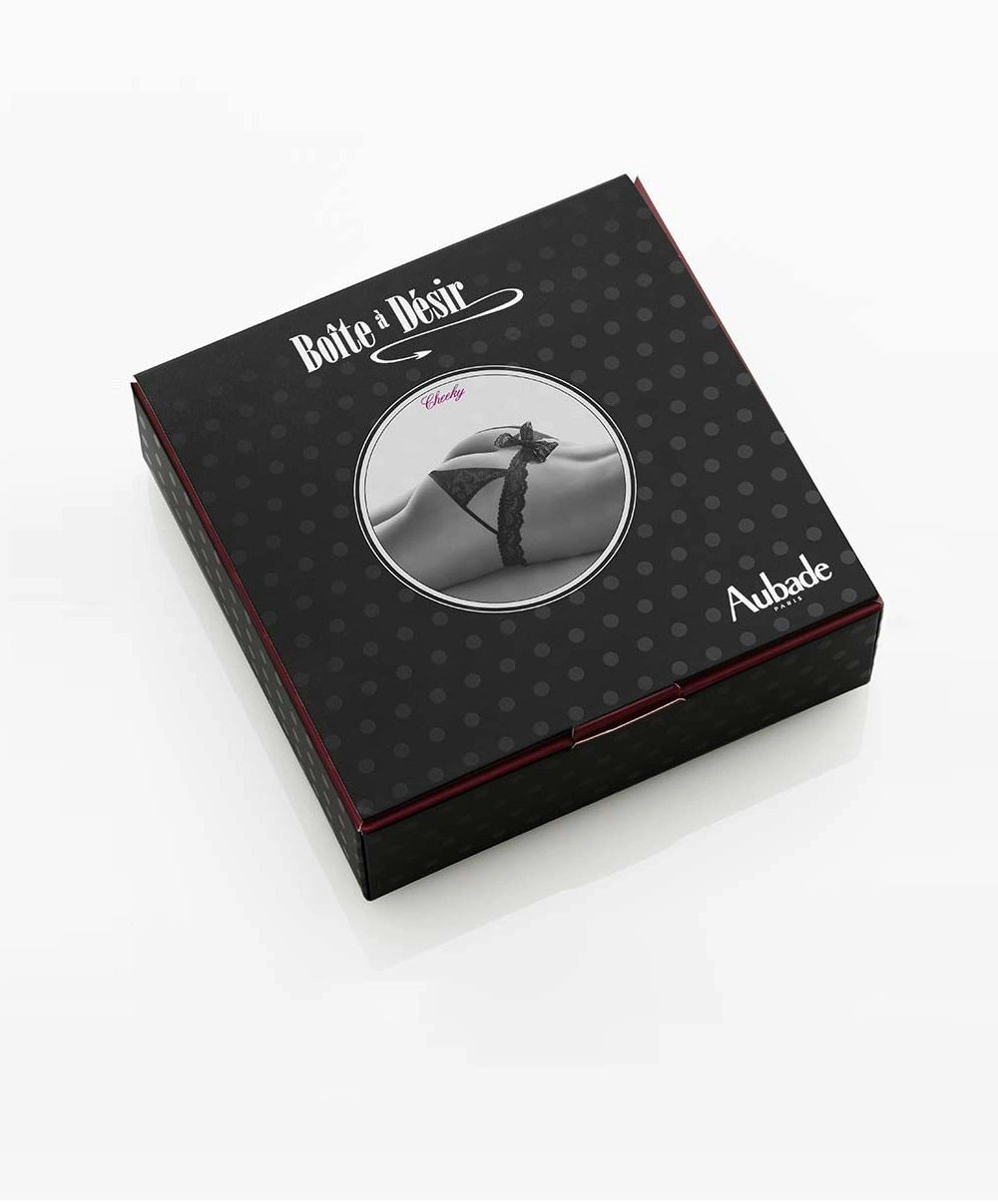 Culotte Cheeky Boite à désir Aubade. Un coffret coquin qui comprend un culotte très sexy, ouverte au dos et des rubans en dentelle à nouer à l’arrière. Découvrez cette nouveauté aubade ultra sexy avec des finitions très coquines pour surprendre…