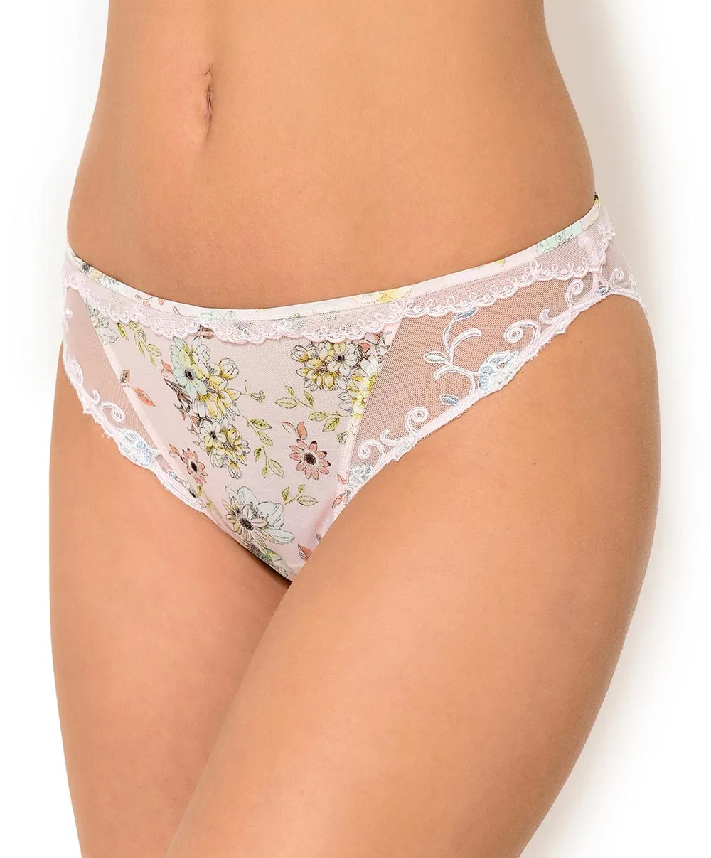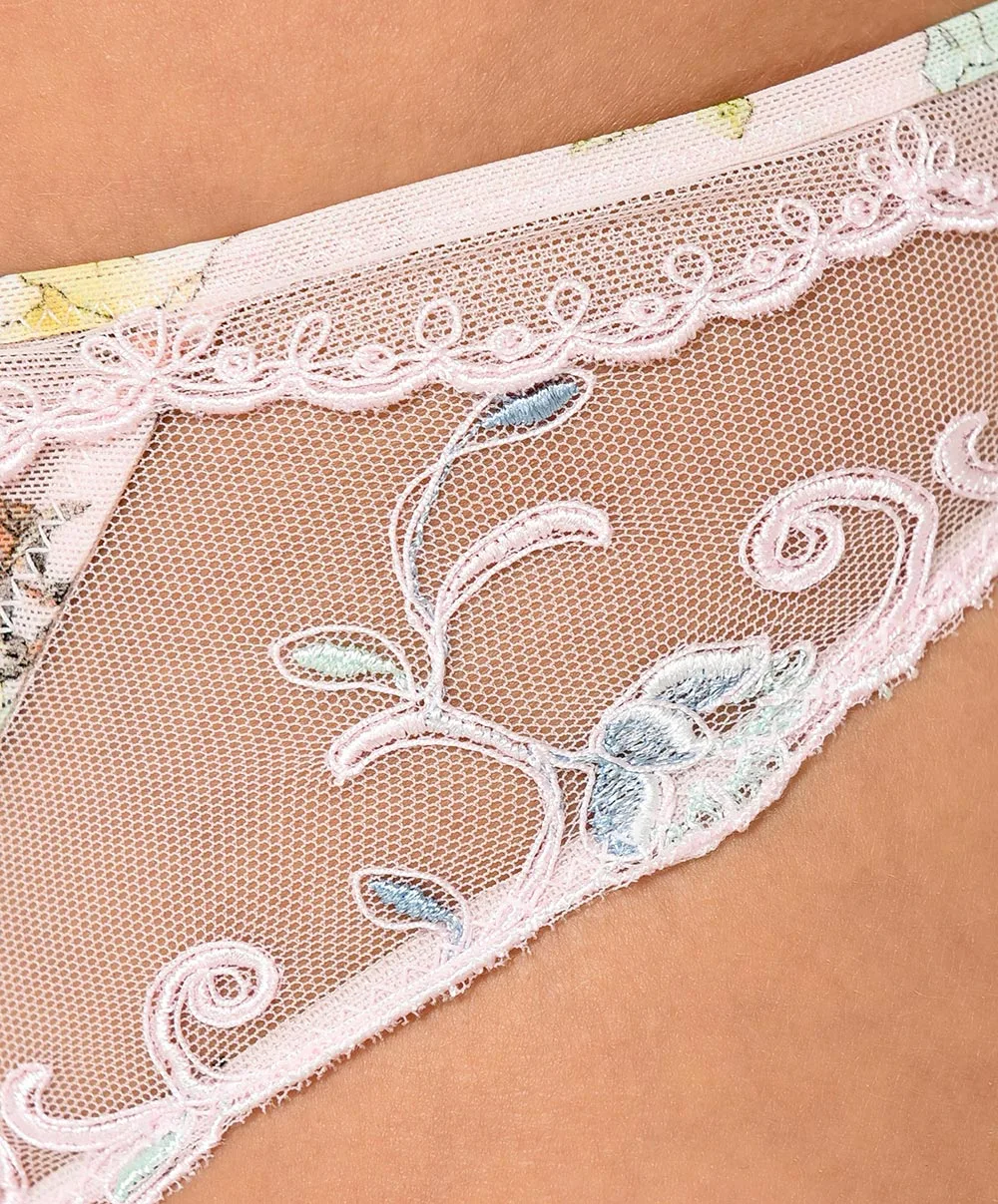 -Ce sous-vêtement chic a été confectionné en tulle léger rose poudré plein de douceur, imprimé de superbes fleurs romantiques pastelles vertes, jaunes, corail et bleues ciel pour une allure ultra-féminine dans un esprit bucolique.