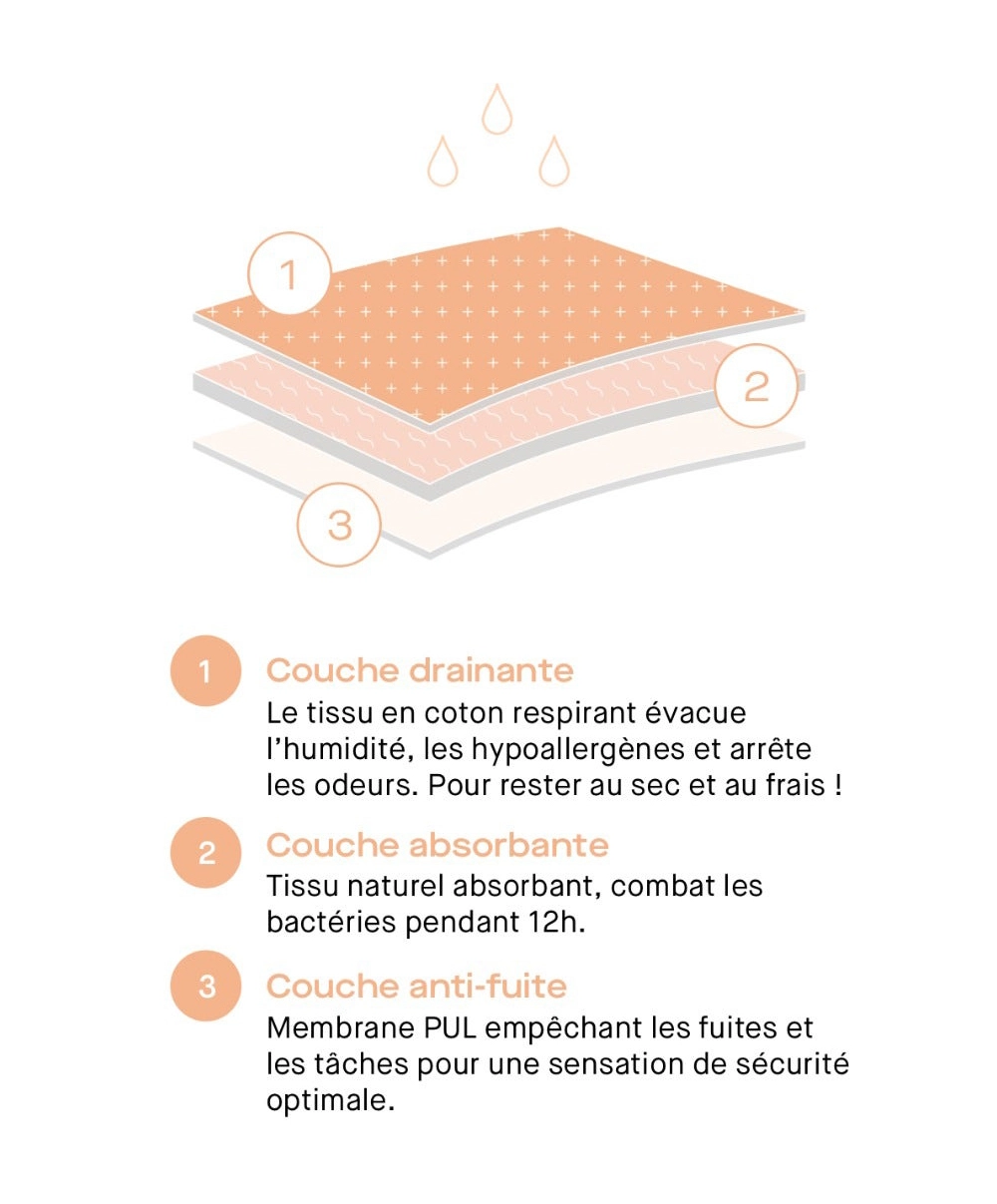 Une patte de fond composée de 3 couches. Une couche drainante hypoallergénique qui permet de se sentir au sec et sans odeur toute la journée. Une couche absorbante et qui lutte contre les bactéries. Une membrane imperméable pour éviter les fuites et se sentir en sécurité. Une patte de fond plus large et longue que dans un bas classique pour éviter les fuites. Une patte de fond entièrement thermocollée pour une totale invisibilité.