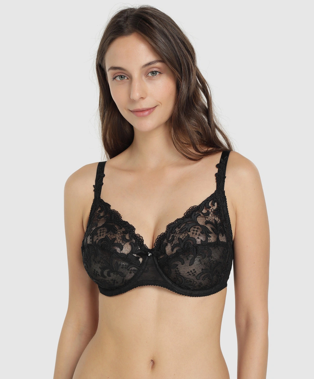 Soutien-gorge couvrant par Éprise de Lise Charmel collection Acanthe Guipure coloris Arty Noir. Ce soutien-gorge a été confectionné en tulle résistant souple aux broderies représentant des feuilles d’acanthe spectaculaires pour un visuel élégant et un maintien parfait. Les bonnets en 3 parties à la coupe enveloppante sont doublés en tulle tonique et offrent des renforts latéraux pour un maintien exceptionnel. La ligne de décolleté y est délicatement ornementée par des à motifs guipures qui apportent une touche de romantisme à ce dessous chic. Côté finitions, vous retrouverez au séparateur un noeud en organza mettant sous le feu des projecteurs un sublime strass Swarovski couleur diamant étincelant. Cette création Éprise fera un excellent soutien-gorge grande taille (décliné jusqu’au bonnet G) avec notamment son dos cheminée et sa structure spécialement étudiée pour les femmes à la beauté généreuse.