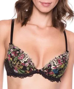 Soutien-gorge push-up fleurs de jungle de la marque de lingerie lise charmel. Ouvrez grand les yeux en profitez du spectacle ! La nature luxuriante est omniprésente avec un imprimé coloré sur tulle au niveau des coques qui contraste avec le noir intense d’une dentelle de Calais-Caudry tissée en France pour un résultat véritablement époustouflant. Les coussinets amovibles qui garnissent les bonnets offrent un bel effet push et permettent de galber la poitrine tout en offrant un décolleté vertigineux. Les bretelles spaghettis satinées, les petits petits noeuds en satin, le bijou swarovski à l’entre-seins sont autant de délicates attention qui participent à la mise en beauté de ce dessous. On craque pour cette dentelle qui parcoure la basque et le dos ainsi que pour l’empiècement de broderie florale au décolleté qui souligne le galbe naturel de la poitrine. Ce soutien-gorge lise charmel est l’atout séduction de cette collection haute en couleurs!
