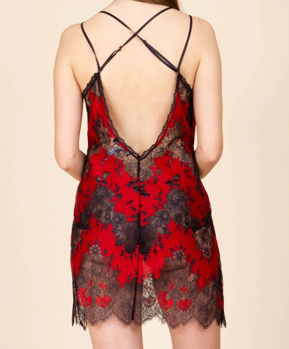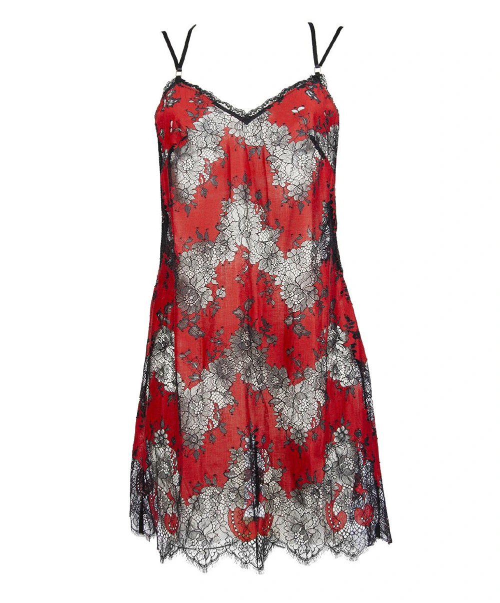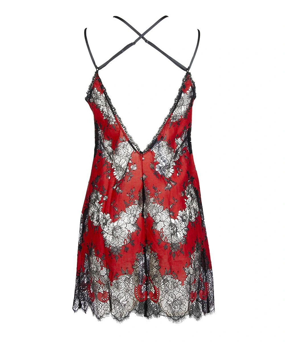 -Article de lingerie de nuit confectionné en maille rouge flashy contrasté par une dentelle noire florale dont les jeux de transparence vous prêteront des allures de séductrice assumée.
