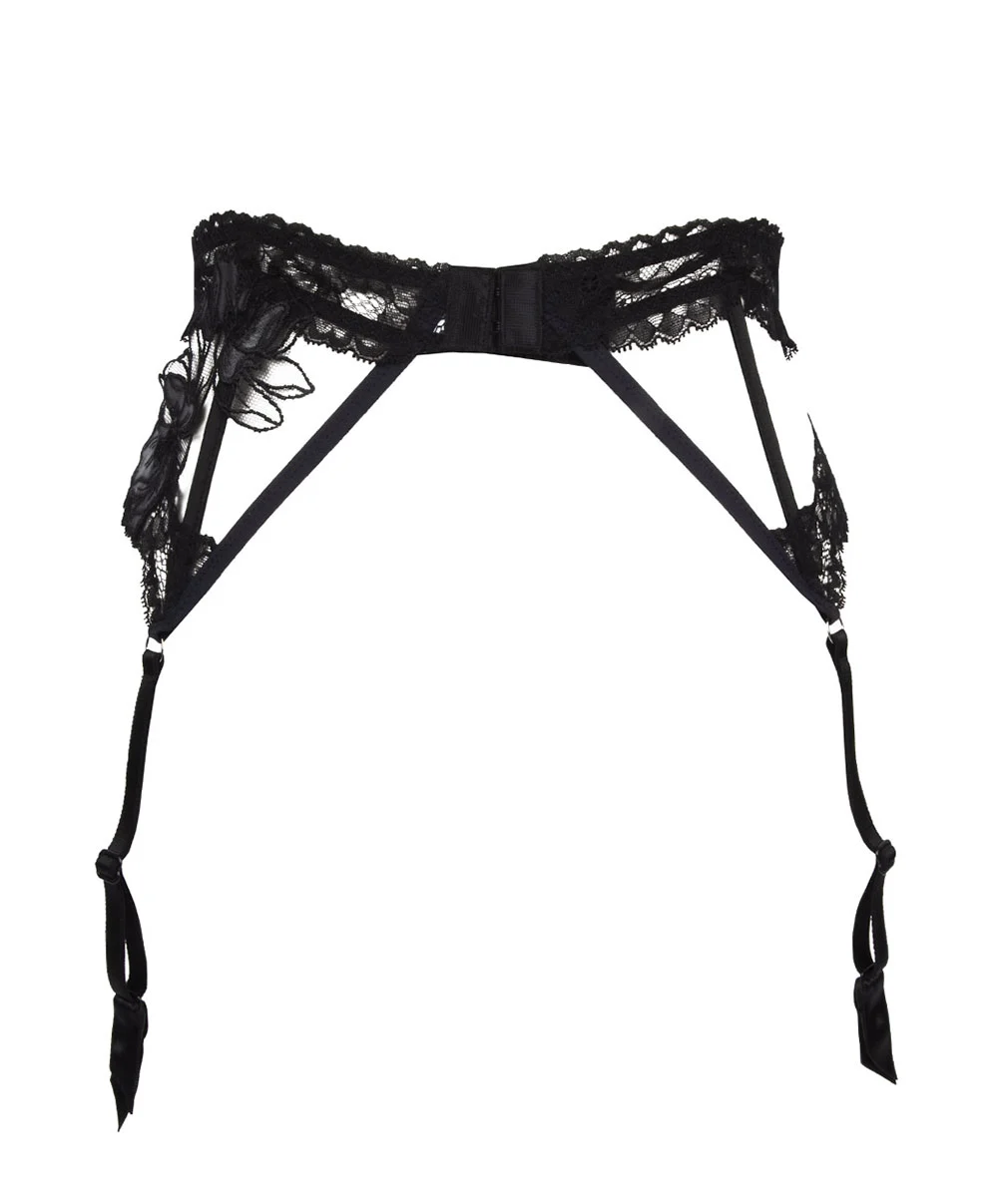 -Détails : vous attacherez (ou détacherez!) ce porte-jarretelles gâce à un système d’agrafe au dos. Des jarretelles de satin naissant d’un anneau argenté cousu sur un lien de tulle, en clin d’oeil au bondage, vous permettront de les attacher à des bas pour un ensemble lingerie dont le maître mot est séduction !