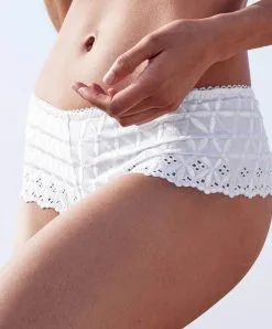 Votre ligne phare d’aubade Paris fait peau neuve et s’offre une véritable cure de jouvance. Plus moderne et plus confortable avec sa maille en coton lycra clean cut, vous apprecierez toujours autant ce shorty aubade et sa broderie anglaise découpée effet tatoo. Cette forme met en avant le creux des reins et le galbe des fesses pour notre plus grand plaisir. La fraicheur du coloris blanc et le romantisme des motifs subliment votre silhouette dans une douce sensualité. Ce que l’on retient le plus ici c’est l’échancrure originale au dos en forme de coeur qui est rehaussée par le fameux laçage satiné faisant de ce sous-vêtement en coton un must have de la saison.