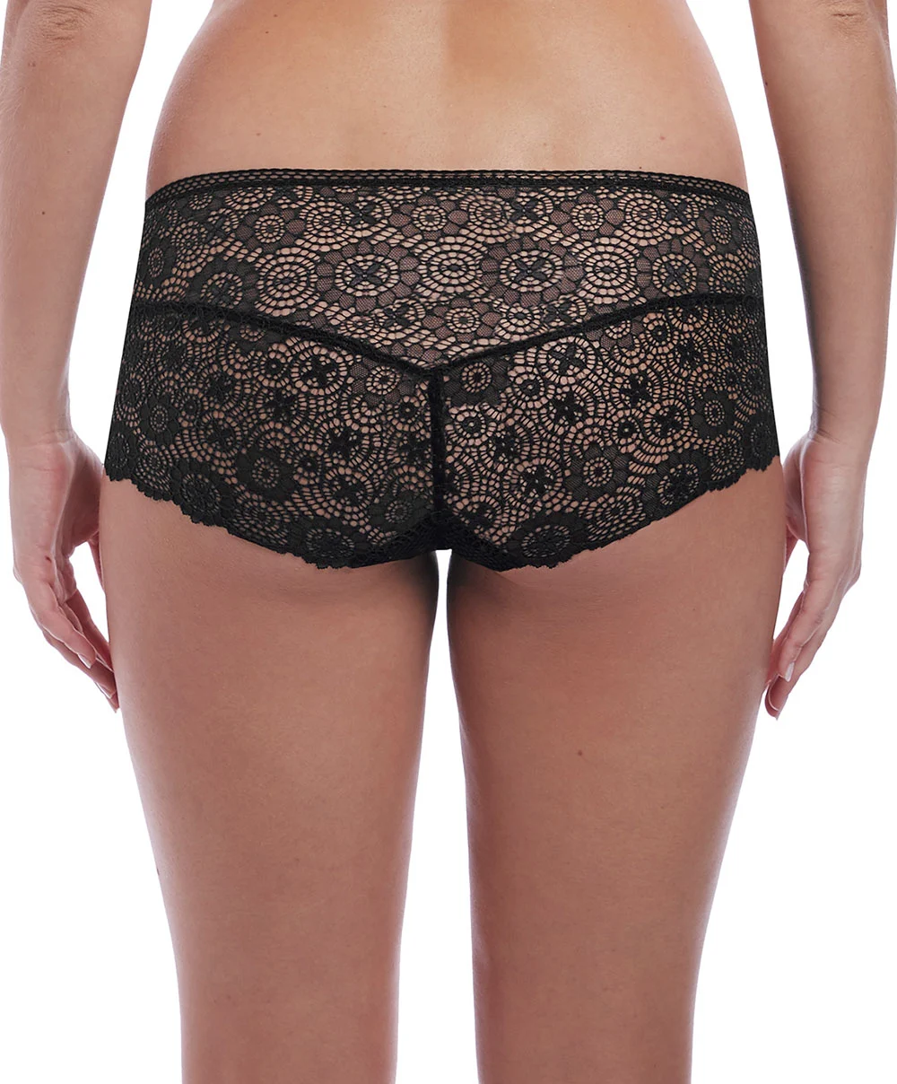 Shorty transparent collection Expression de chez Freya lingerie. Ce shorty Freya noir sexy et confortable met en valeur une maille à motifs géométriques ainsi qu’une dentelle crochet, toutes deux ajourées pour un sex-appeal garanti. Les finitions de ce shorty femme comprennent une taille élastique soulignée de picots au design très contemporain pour un look original ainsi qu’une doublure à l’entrejambe pour protéger votre intimité et vous procurer un confort inégalé.