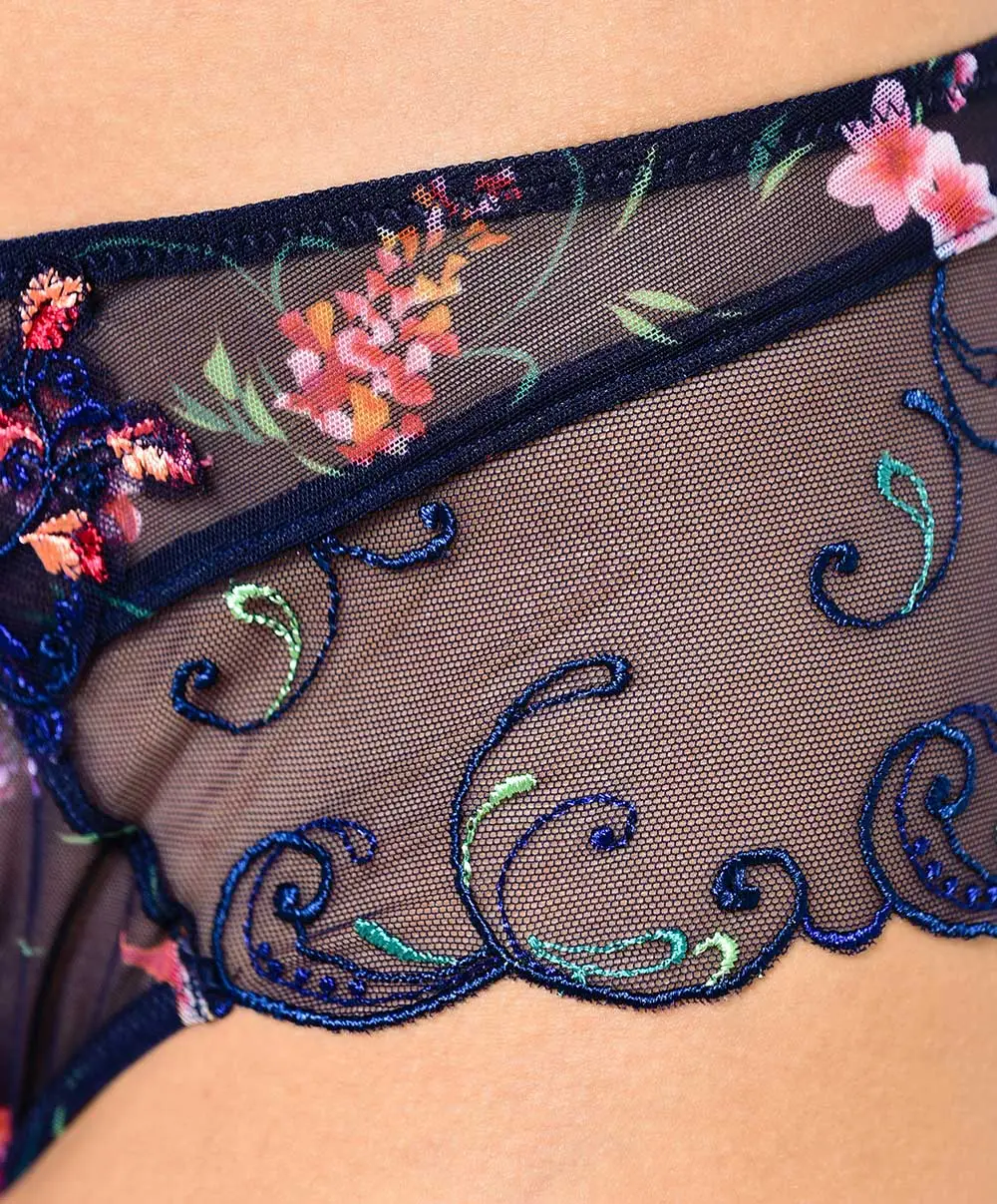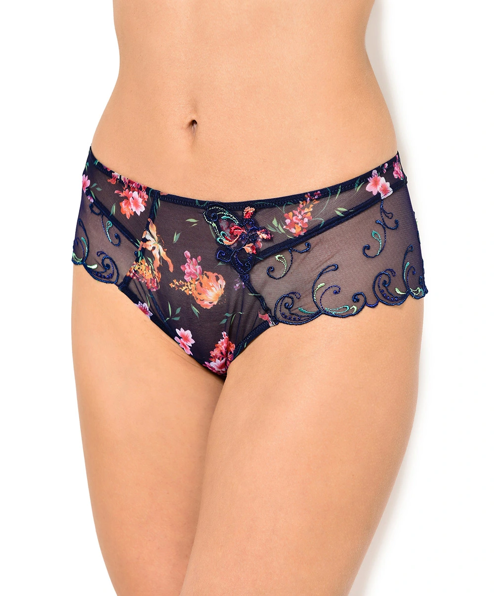 Shorty transparent de la collection Fête de Venise par Lise Charmel. Ce dessous chic est fait d’un superbe tulle fin bleu foncé imprimé de motifs floraux chatoyants aux couleurs vives qui tranchent. Sa coupe relativement échancrée et les jeux de transparence dont il est le théâtre vous confèreront un côté sexy indéniable. Côté finitions, vous retrouverez une belle guipure florale devant ainsi qu’un petit noeud en organza bleu foncé qui surmonte une ouverture en forme de goutte au dos du shorty. Pour plus de réconfort, le gousset est doublé 100% coton.