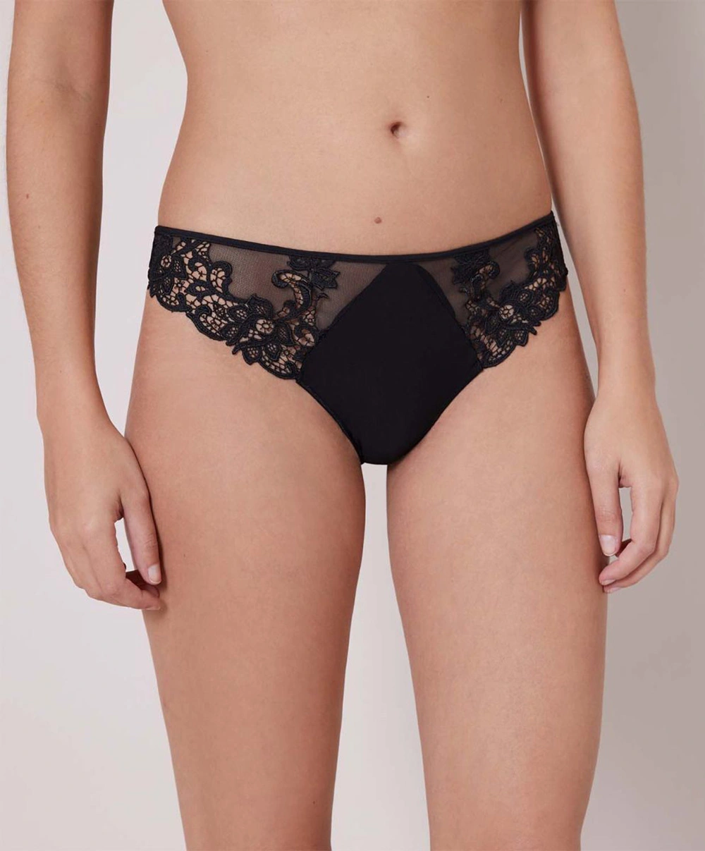 String noir collection Saga de chez Simone Pérèle à la coupe dégagée au dos pour une allure glamour et sexy et des fesses révélées de manière plutôt culotée ! Ce sous-vêtement très féminin offre des empiècements de tulle rehaussé par une guipure florale à l’avant et son une ouverture en V au dos à la taille ponctuant admirablement le creux de vos reins. Pour jouer le total look black, ce trio de matières présente la même couleur noire pour un visuel élégant et sans âge. Détail pratique : finition clean cut au dos en maille opaque pour un effet invisible sous les vêtements.