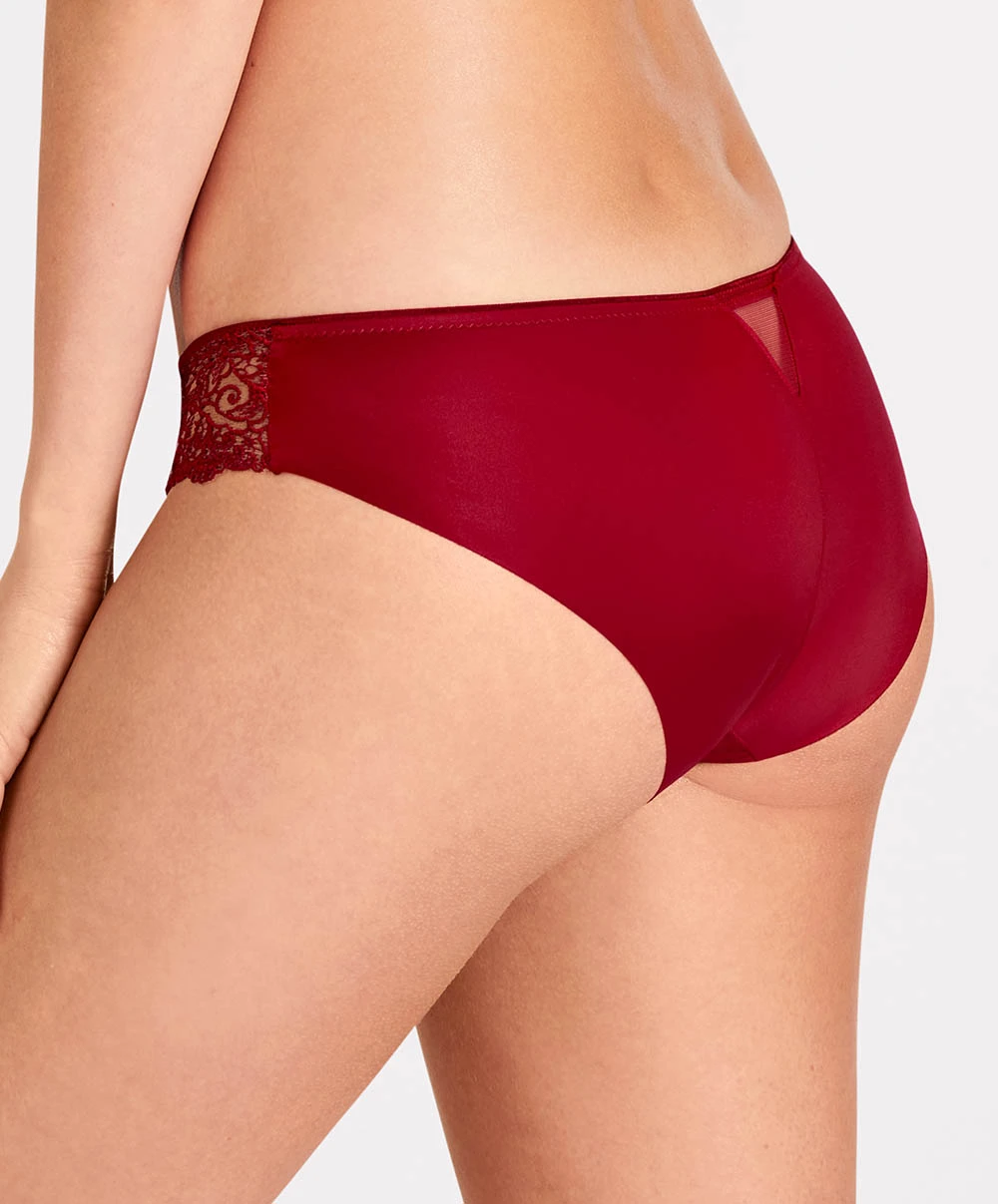 Imaginé avec les designers de la marque Karl Lagerfel, ce slip Aubade à la forme brésilienne sublime les courbes féminines avec sa broderie Suisse effet guipure transparente doublée d’une maille Clean Cut satinée sur le devant. Ultra travaillée, cette broderie est tout simplement sublime. Un bouton de satin fait son apparition sur le devant pour un look smoking très cher à l’univers de KL. Une coupe qui emboite bien les fesses et les hanches tout en découvrant le bas des fesses. So sexy !
