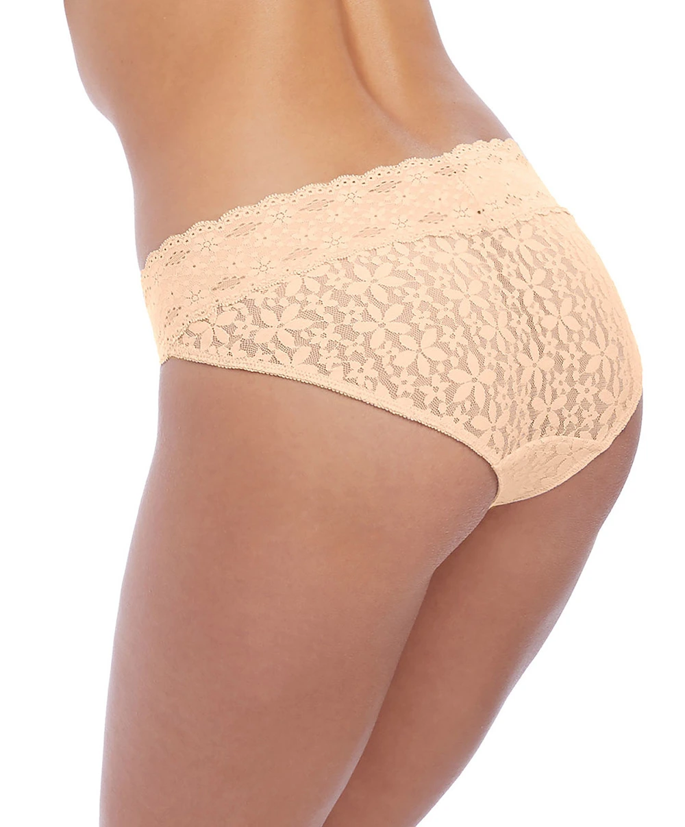 Slip dentelle forme brésilienne collection de lingerie permanente Wacoal Halo Lace, coloris nude (=peau).