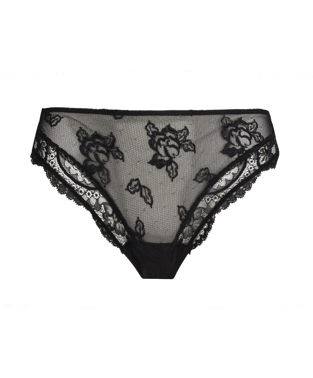 -Cette petite culotte joue le voilé/dévoilé avec devant la transparence (dentelle Leavers florale et tulle plumetis ajouré briodé de grandes fleurs) tandis que le dos est fait d’une maille soyeuse satinée noire opaque pour vous apporter maintien et confort.