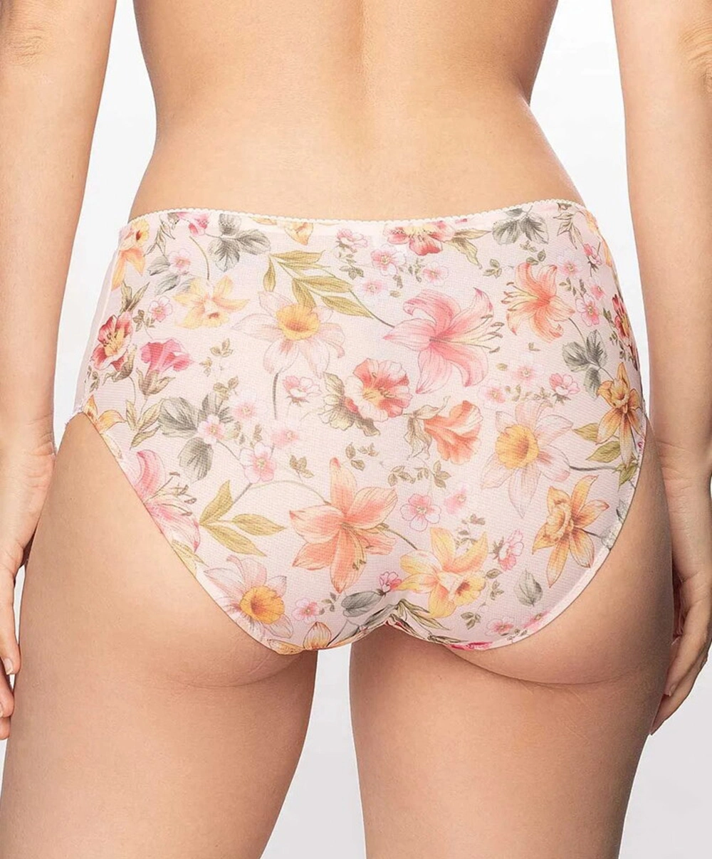 – Milieu devant et dos en tulle imprimé. Cuisse devant et empiècements en tulle brodé festonné, devant doublé.