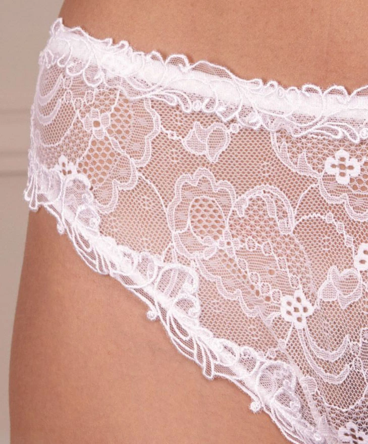 Slip séduction tout en dentelle de Calais aux motifs floraux, collection Soir de Venise de chez Lise Charmel. La légèreté de la dentelle vient délicatement souligner le galbe de vos fesses. Détails chics : la découpe en « V » au dos rehaussée par un joli bijou en forme de masque vénitien sur un beau noeud satiné. On aime la pureté de la ligne et son style baroque épuré ainsi que les jeux de transparence qui font de ce dessous une pièce haute en séduction. Idéal pour les futures mariées !