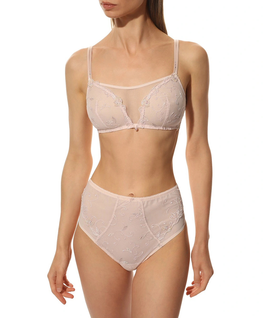 -Dessous chic confectionné dans un tulle rose poudré associé à un des broderies et guipures florales représentant des roses et des végétaux pour un look ultra-romantique.