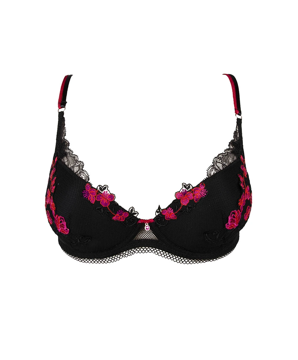 Un soutien-gorge coque à armature au décolleté plongeant qui sublime le galbe des seins. Résultat, une poitrine galbée et arrondie. Les bonnets sont recouverts de résille agrémentée d’une broderie colorée sur le devant. La basque en résille, est soulignée au bas par une fine dentelle fuseau élastique. Les bretelles devant sont composées d’une bretelle fantaisie rose côté décolleté et d’une bretelle satinée noir au côté emmanchure, le tout maintenu par des boucleries roses dorées. C’est une véritale farandole de différentes dentelles que l’on retrouve sur cette pièce et ce pour notre plus grand plaisir.