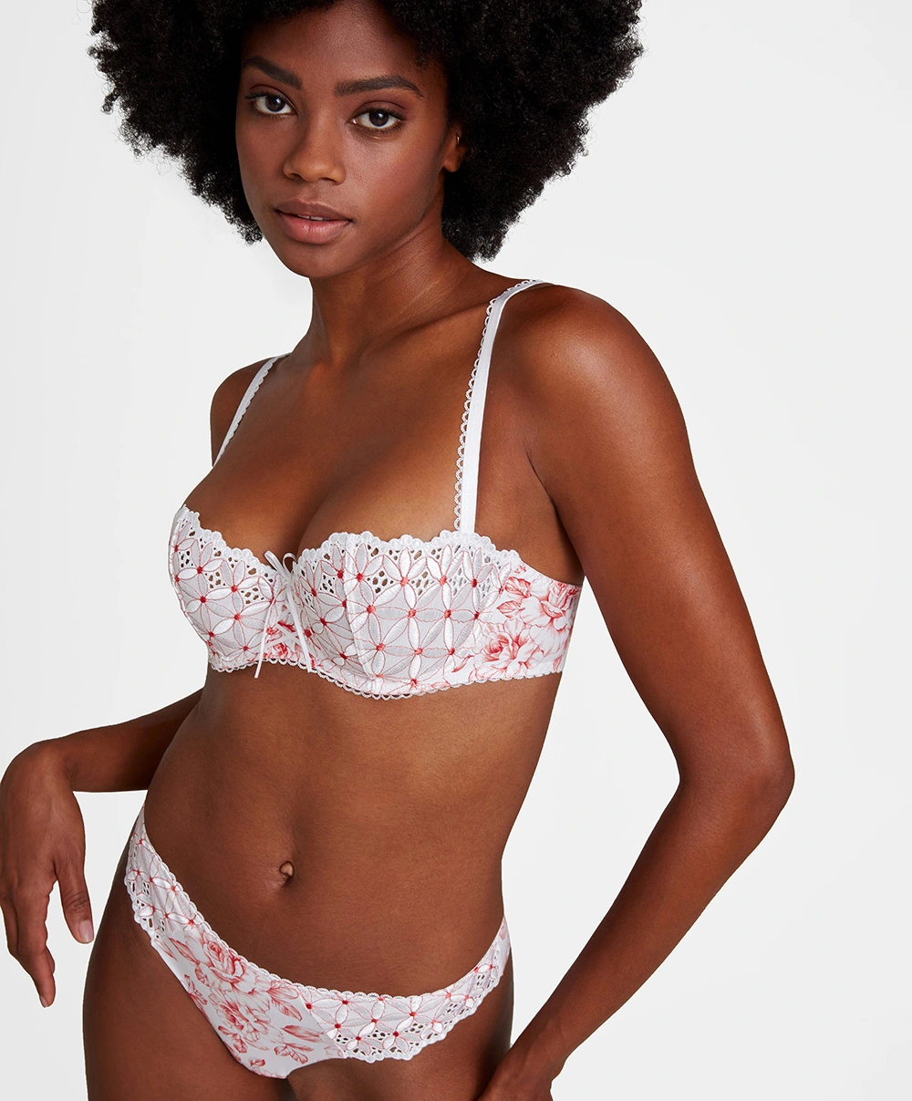 -Ce que l’on retient le plus ici c’est la jolie broderie anglaise sur les bonnets coqués et les petits détails séduction à la basque, à l’entre-seins, sur les bretelles, tels que le noeud satiné au séparateur ou les picots orenementant les contours du soutien-gorge par exemple.