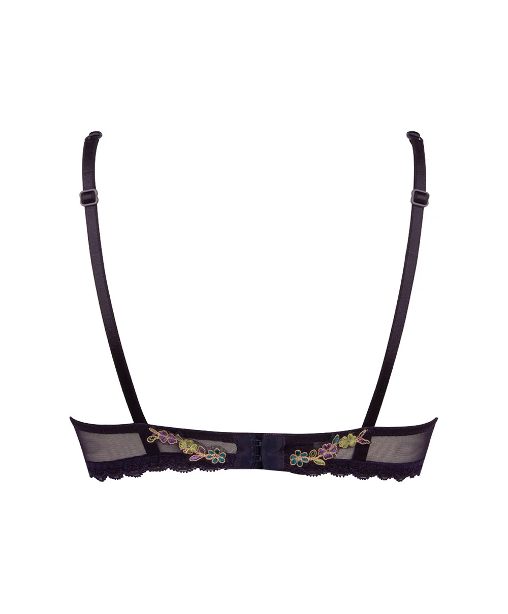 -Ce soutien-gorge demi-couvrant offrant un beau décolleté pigeonneant est conçu en deux parties avec des bas bonnets en maille imprimée motifs paisleys orientaux, tandis que les haut-bonnets sont constitués d’une laize de dentelle fleurie ajourée au paroxysme du raffinement.