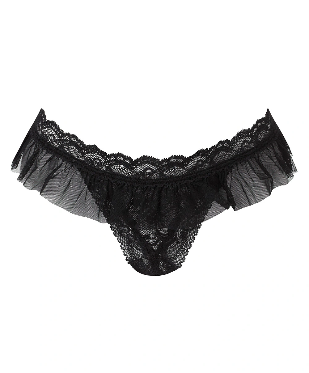 String fendu Aubade des boites à désir. Ultra sexy en dentelle noire, orné d’un délicieux tour de taille en tulle frou-frou. Sa taille en galon dentelle se noue dans le dos pour un fini parfaitement ajusté et provoquant.