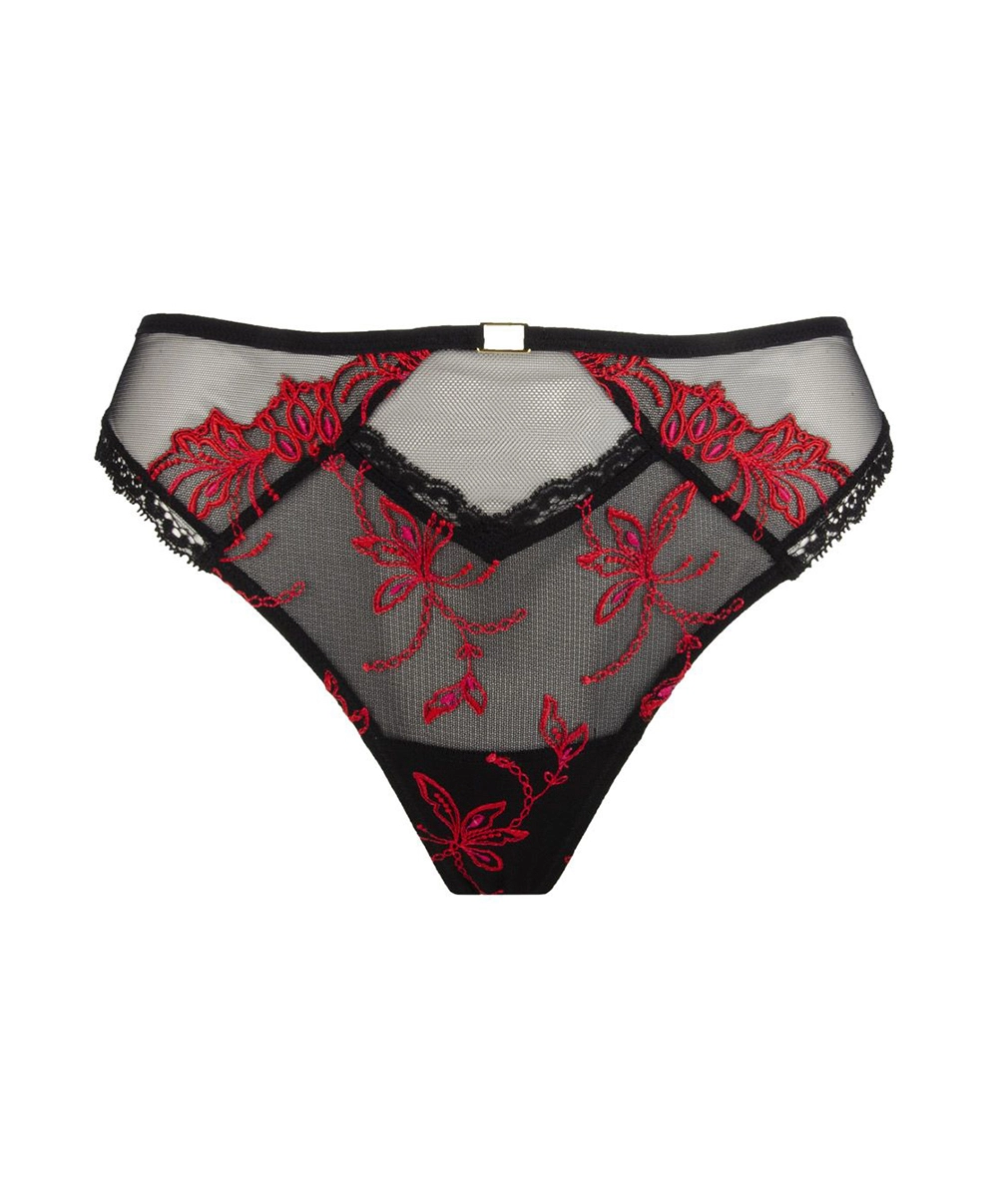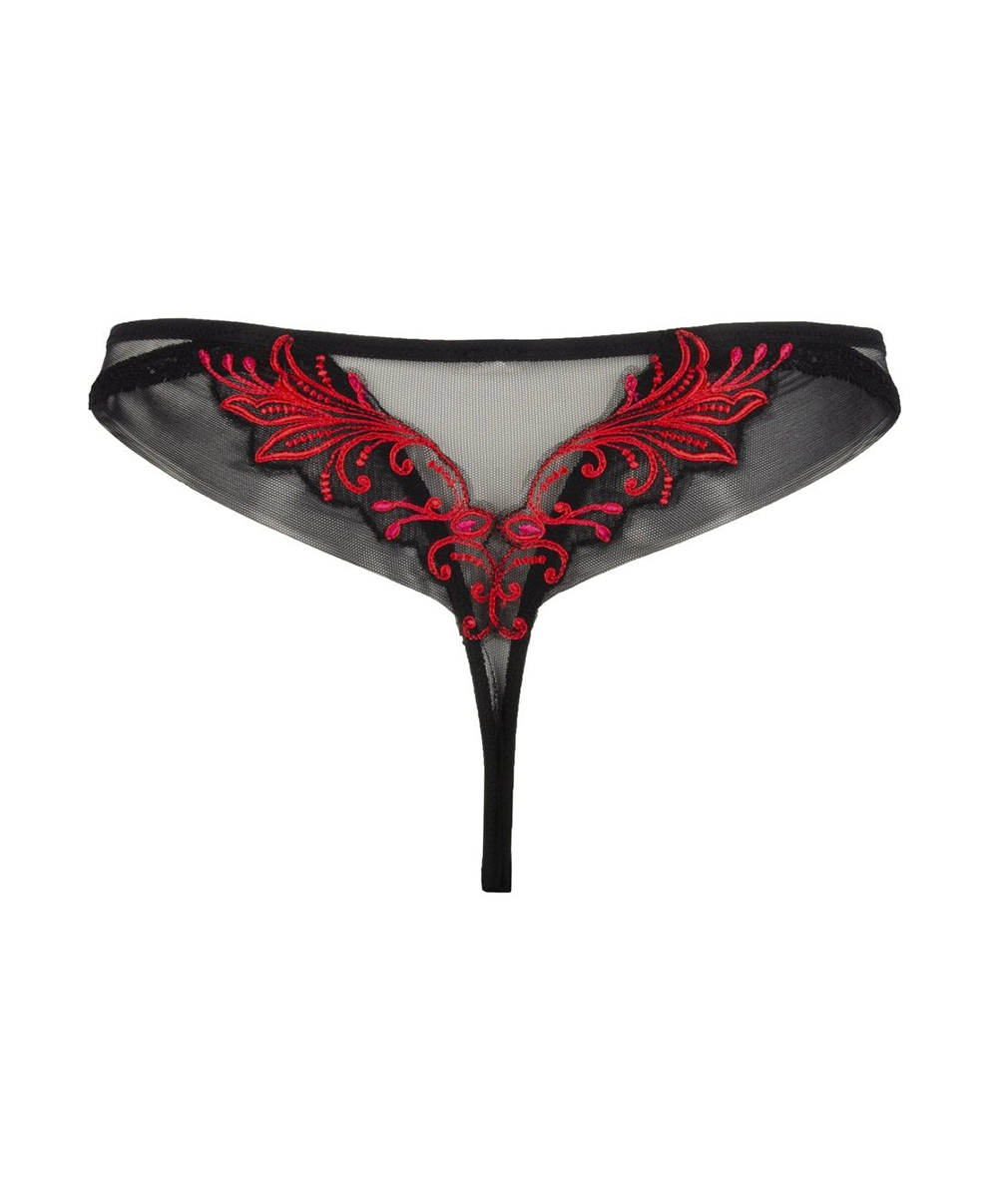 -Dessous chic confectionné en tulle noir ajouré aux broderies baroques rouges constellées de détails fuchsias pour une allure exaltée.