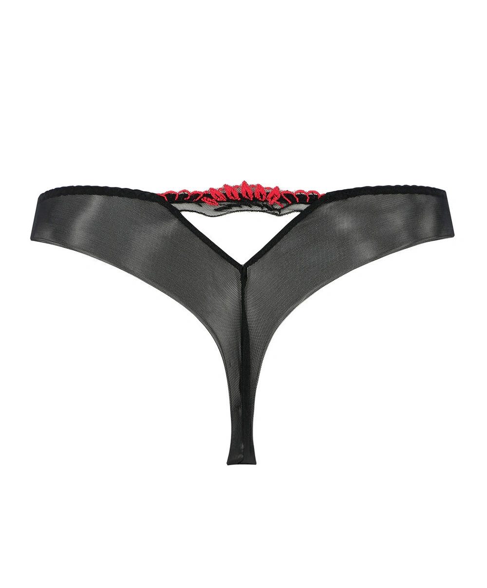 Tanga Lise Charmel de la collection Écrin Désir. Ce string a été confectionné en tulle noir embelli par de superbes broderies rouges vives pour un contraste détonnant et une association de couleurs synonyme de passion brûlante. La coupe dégagée de ce dessous chic mettra en valeur vos fesses en les dévoilant de manière suggestive et en soulignant leur galbe pour faire de vous une redoutable séductrice. Vous apprécierez également les guipures florales aux couleurs chatoyantes devant et sumontant l’ouverture au niveau du creux des reins ! Craquez pour ce tanga sexy aà souhait !